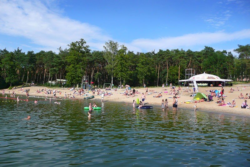 Szeroka, piaszczysta plaża z kąpieliskiem, leżakami, pomostami i strefą dla dzieci